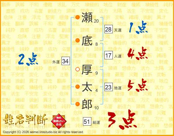 瀬底厚太郎さんの総運は51画の3点!