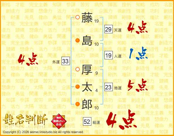藤(19画)島(10画) 厚(9画)太(4画)郎(10画)