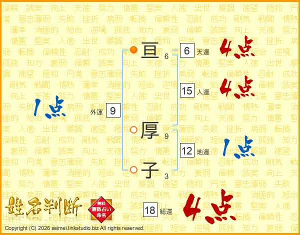 生活面を象徴する運勢です。外部から受ける影響力を表し、結婚運、家庭運や職場、環境への順応性を表します。総運から人運を引いた画数。姓や名が1文字の場合を除く。