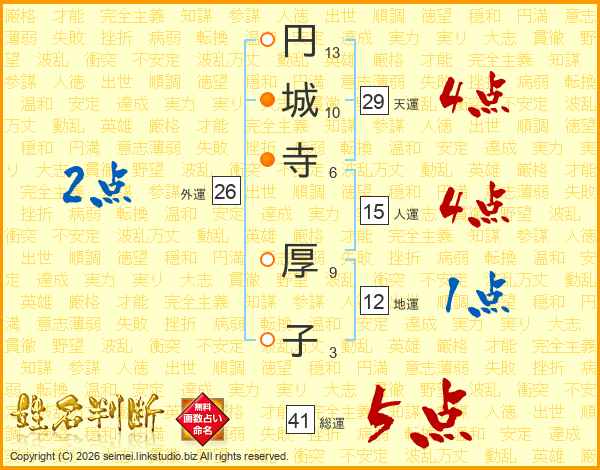 円(13画)城(10画)寺(6画) 厚(9画)子(3画)