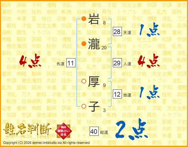 岩(8画)瀧(20画) 厚(9画)子(3画)