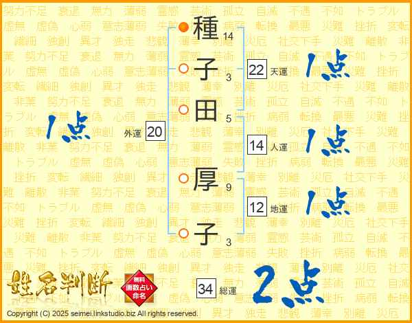 種(14画)子(3画)田(5画) 厚(9画)子(3画)