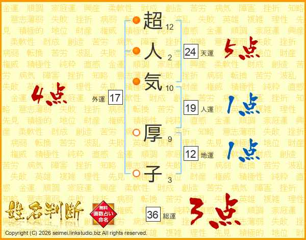 超人気厚子さんの総運は36画の3点!