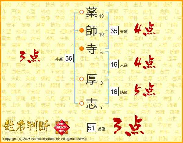 薬(19画)師(10画)寺(6画) 厚(9画)志(7画)