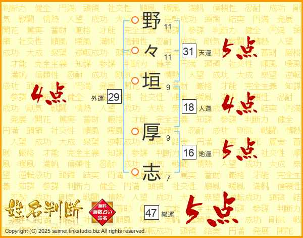 野(11画)々(11画)垣(9画) 厚(9画)志(7画)