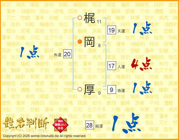 梶(11画)岡(8画) 厚(9画)