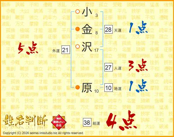 小(3画)金(8画)沢(17画) 原(10画)