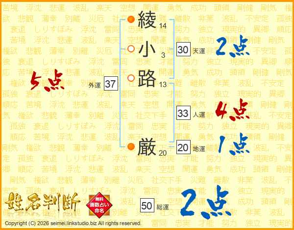生活面を象徴する運勢です。外部から受ける影響力を表し、結婚運、家庭運や職場、環境への順応性を表します。総運から人運を引いた画数。姓や名が1文字の場合を除く。