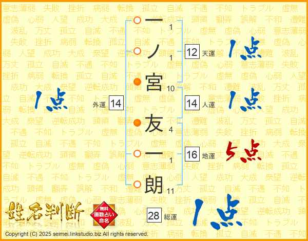 一(1画)ノ(1画)宮(10画) 友(4画)一(1画)朗(11画)