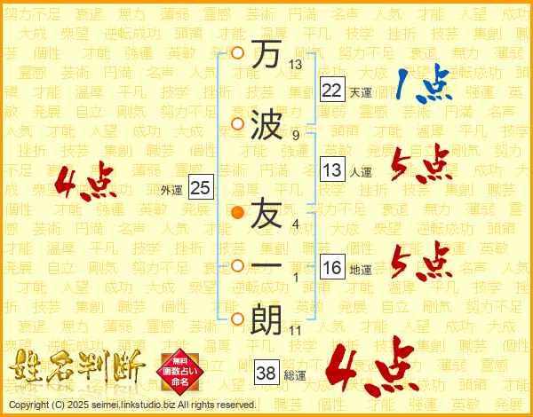万(13画)波(9画) 友(4画)一(1画)朗(11画)