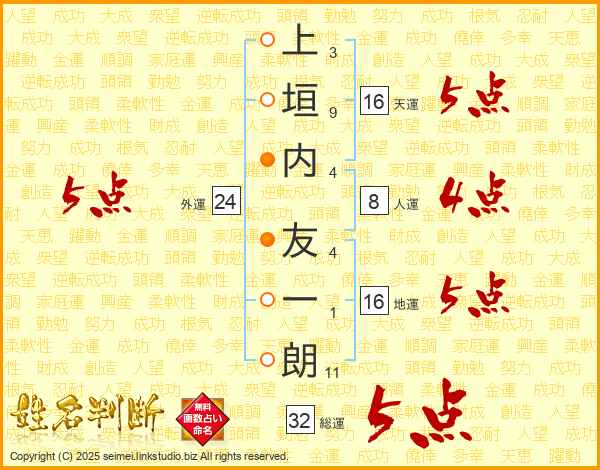 上(3画)垣(9画)内(4画) 友(4画)一(1画)朗(11画)