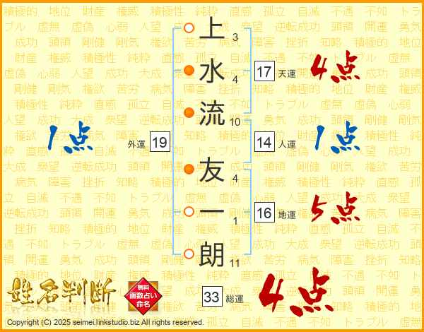 生活面を象徴する運勢です。外部から受ける影響力を表し、結婚運、家庭運や職場、環境への順応性を表します。総運から人運を引いた画数。姓や名が1文字の場合を除く。