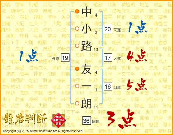 あなたの人生を表す1番重要な運勢です。生涯を通じて影響する総合運となり、主に50歳以降の晩年期に影響を及ぼします。苗字と名前の合計画数。