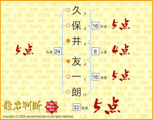 久(3画)保(9画)井(4画) 友(4画)一(1画)朗(11画)