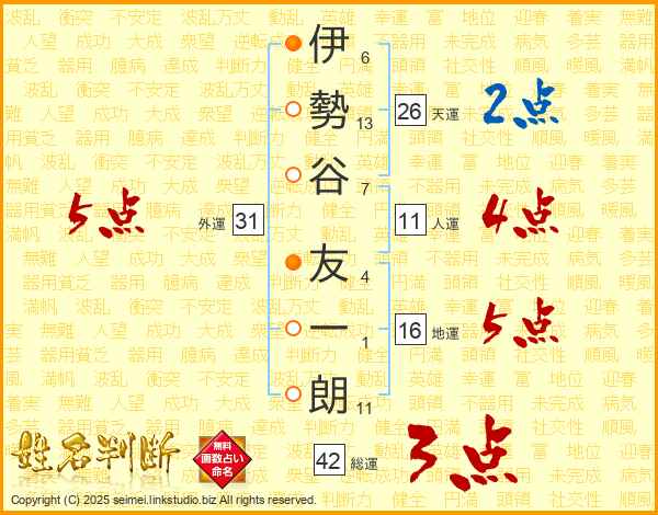 伊(6画)勢(13画)谷(7画) 友(4画)一(1画)朗(11画)