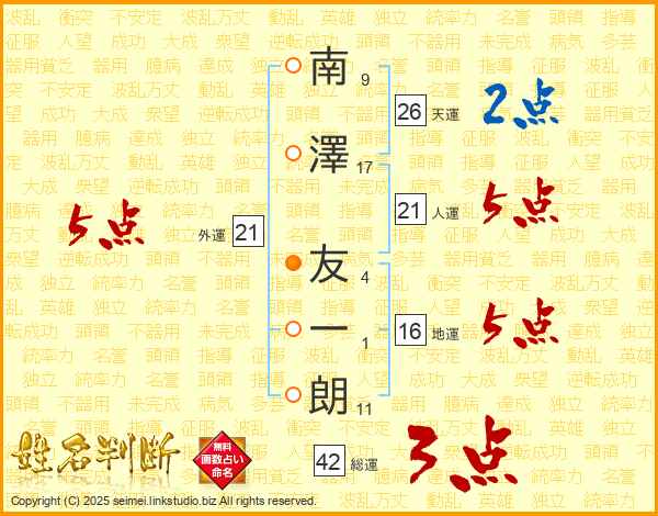 南(9画)澤(17画) 友(4画)一(1画)朗(11画)