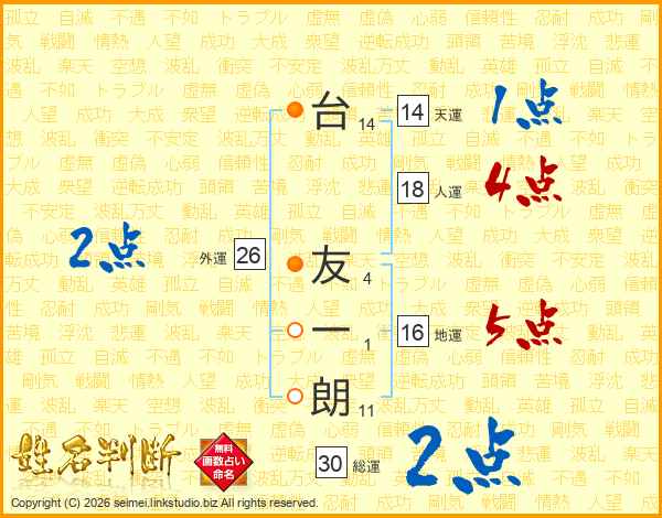 生活面を象徴する運勢です。外部から受ける影響力を表し、結婚運、家庭運や職場、環境への順応性を表します。総運から人運を引いた画数。姓や名が1文字の場合を除く。