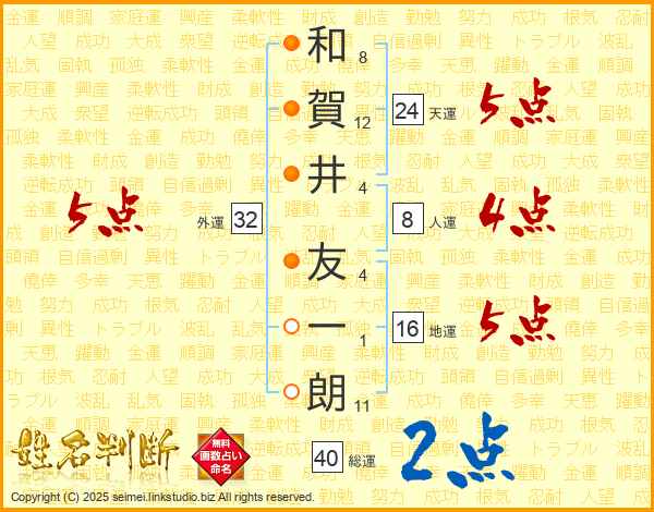 和(8画)賀(12画)井(4画) 友(4画)一(1画)朗(11画)