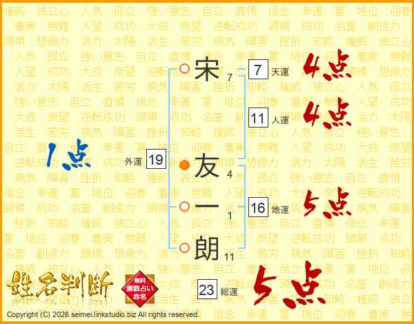 あなたの人生を表す1番重要な運勢です。生涯を通じて影響する総合運となり、主に50歳以降の晩年期に影響を及ぼします。苗字と名前の合計画数。