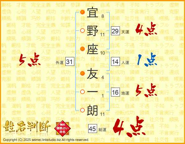 宜(8画)野(11画)座(10画) 友(4画)一(1画)朗(11画)