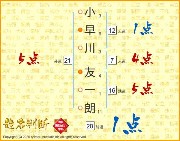 小(3画)早(6画)川(3画) 友(4画)一(1画)朗(11画)