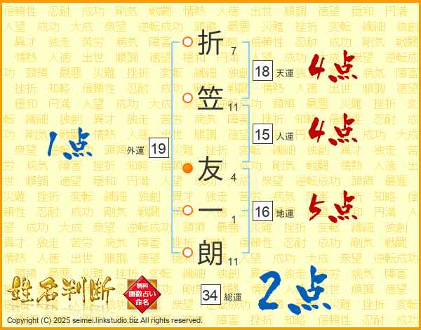 折(7画)笠(11画) 友(4画)一(1画)朗(11画)