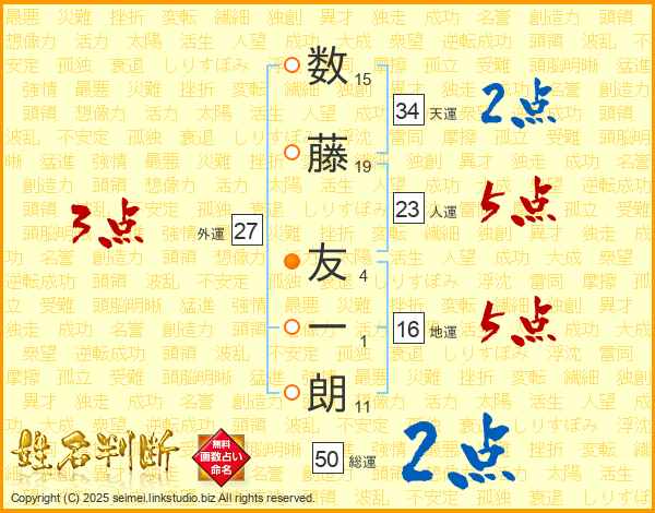 数(15画)藤(19画) 友(4画)一(1画)朗(11画)