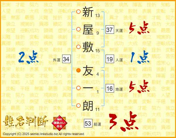 新屋敷友一朗さんの天運は37画の5点!