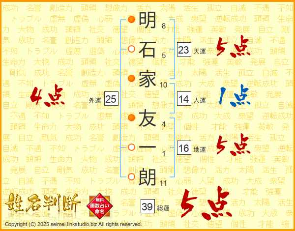 あなたの人生を表す1番重要な運勢です。生涯を通じて影響する総合運となり、主に50歳以降の晩年期に影響を及ぼします。苗字と名前の合計画数。