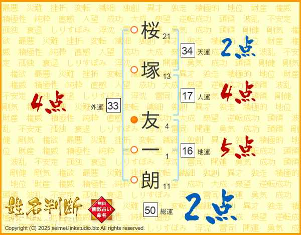 桜(21画)塚(13画) 友(4画)一(1画)朗(11画)