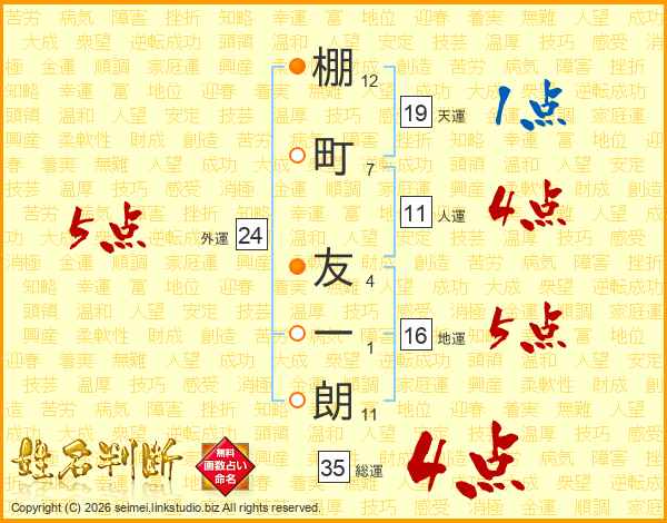 棚(12画)町(7画) 友(4画)一(1画)朗(11画)
