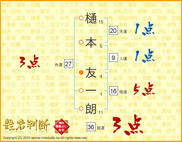樋(15画)本(5画) 友(4画)一(1画)朗(11画)