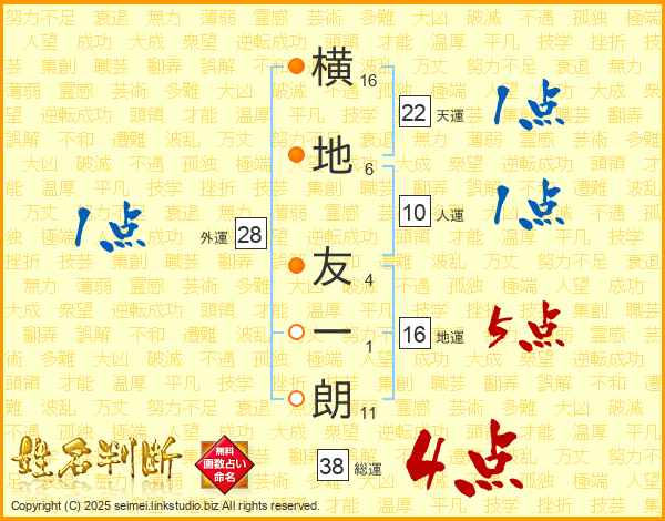 生活面を象徴する運勢です。外部から受ける影響力を表し、結婚運、家庭運や職場、環境への順応性を表します。総運から人運を引いた画数。姓や名が1文字の場合を除く。