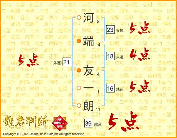 河端友一朗さんの総運は39画の5点!