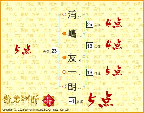 浦嶋友一朗さんの総運は41画の5点!
