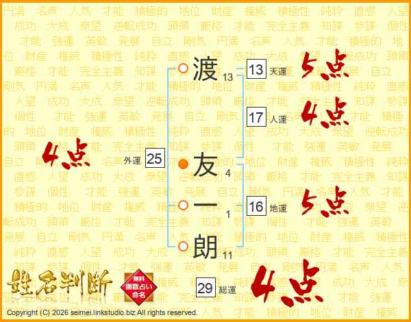 あなたの人生を表す1番重要な運勢です。生涯を通じて影響する総合運となり、主に50歳以降の晩年期に影響を及ぼします。苗字と名前の合計画数。