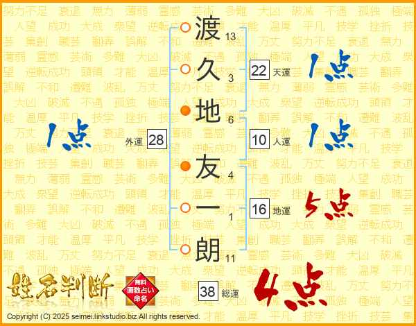 渡久地友一朗さんの総運は38画の4点!