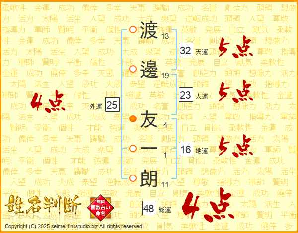 渡(13画)邊(19画) 友(4画)一(1画)朗(11画)
