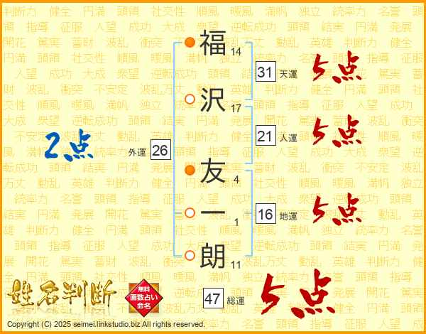 福(14画)沢(17画) 友(4画)一(1画)朗(11画)