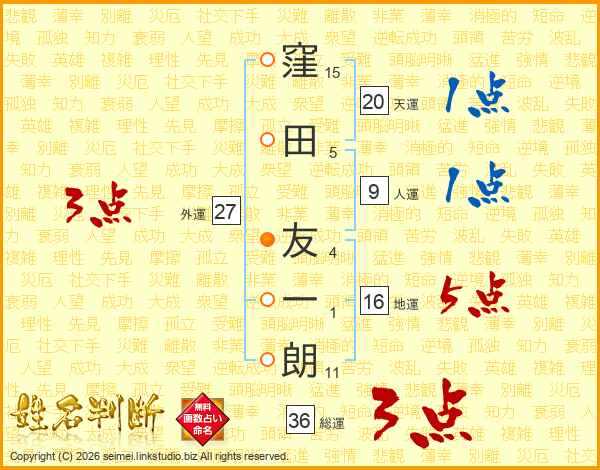 窪(15画)田(5画) 友(4画)一(1画)朗(11画)