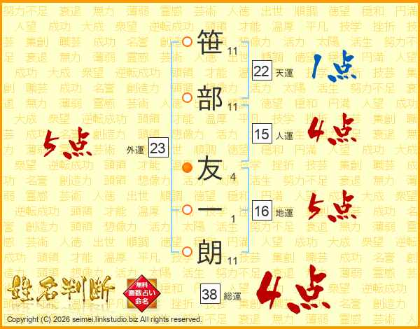 笹(11画)部(11画) 友(4画)一(1画)朗(11画)