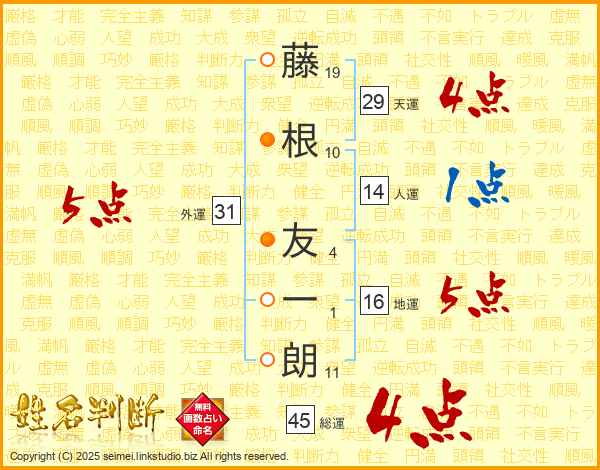 藤(19画)根(10画) 友(4画)一(1画)朗(11画)