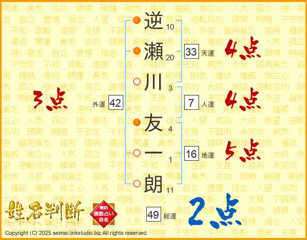 逆(10画)瀬(20画)川(3画) 友(4画)一(1画)朗(11画)