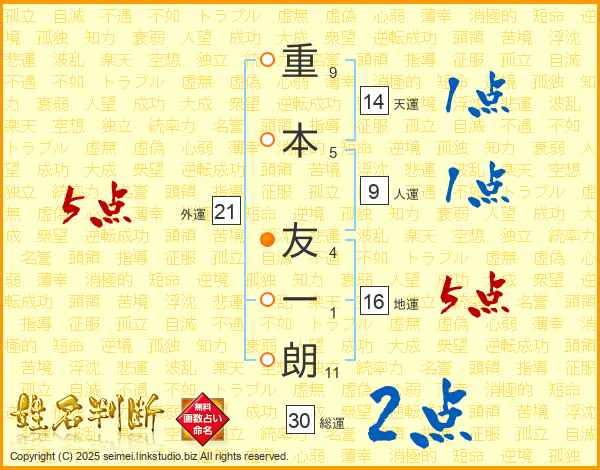 重(9画)本(5画) 友(4画)一(1画)朗(11画)