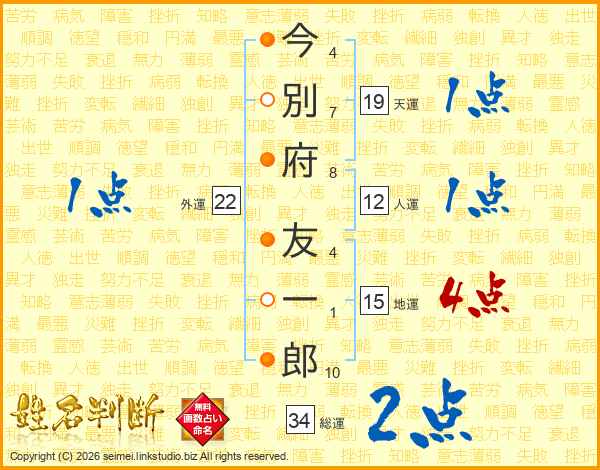 今(4画)別(7画)府(8画) 友(4画)一(1画)郎(10画)