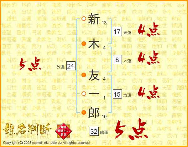 新(13画)木(4画) 友(4画)一(1画)郎(10画)