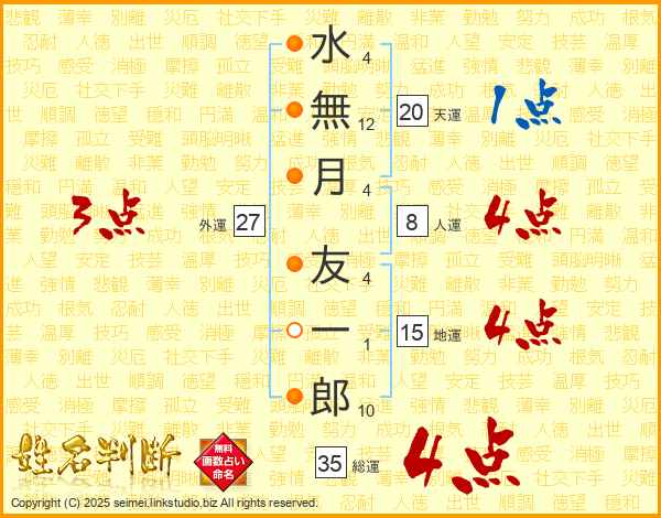 水(4画)無(12画)月(4画) 友(4画)一(1画)郎(10画)