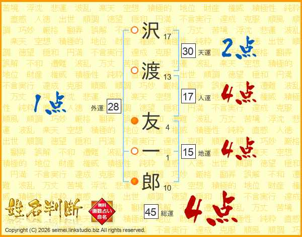 沢(17画)渡(13画) 友(4画)一(1画)郎(10画)
