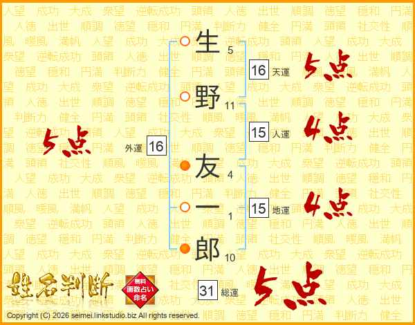 生野友一郎さんの総運は31画の5点!