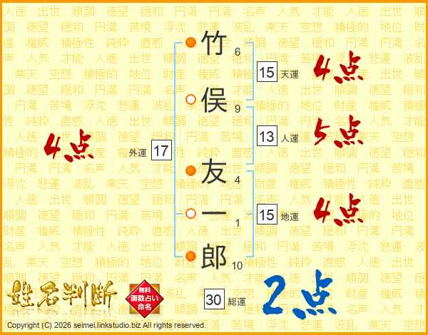 竹(6画)俣(9画) 友(4画)一(1画)郎(10画)